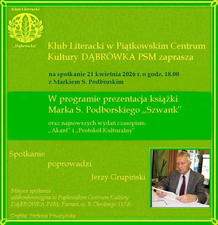 Tags: *Autorka obrazów, grafik, fotografii: Stefania PruszyńskaKlub Literacki „Dąbrówka”. Programy spotkań od 2008 rokuKrużganki kulturyMarek S. PodborskiObrazy, grafiki, fotografie, filmy, plakaty...Pisarze. Poeci. W ogrodach literatury......