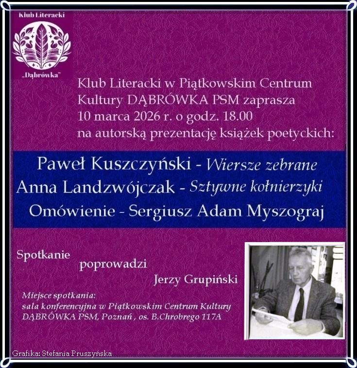 Tags: *Autorka obrazów * grafik * * fotografii reportaż., artystycznych: Stefania Pruszyńska*Autorka tekstu: Stefania Pruszyńska*Eseje * Utwory * Artykuły* **Rozmowy – wywiady – sondaże* *Reportaże* *Recenzje* *Felietony* *Polemiki* *Informacje*Anna LandzwójczakJerzy Grupiński - "Dąbrówka" Klub LiterackiKLUB LITERACKI „DĄBRÓWKA”. Programy spotkań od 2008 roku * PROTOKÓŁ KULTURALNY W PDF*****************Krużganki kultury*****Obrazy * Grafiki * Rysunki * Fotografie * Filmy * Plakaty * NagraniaPaweł KuszczyńskiPisarze * Poeci * W ogrodach literaturySergiusz Adam MyszograjW Poznaniu * Wielkopolsce